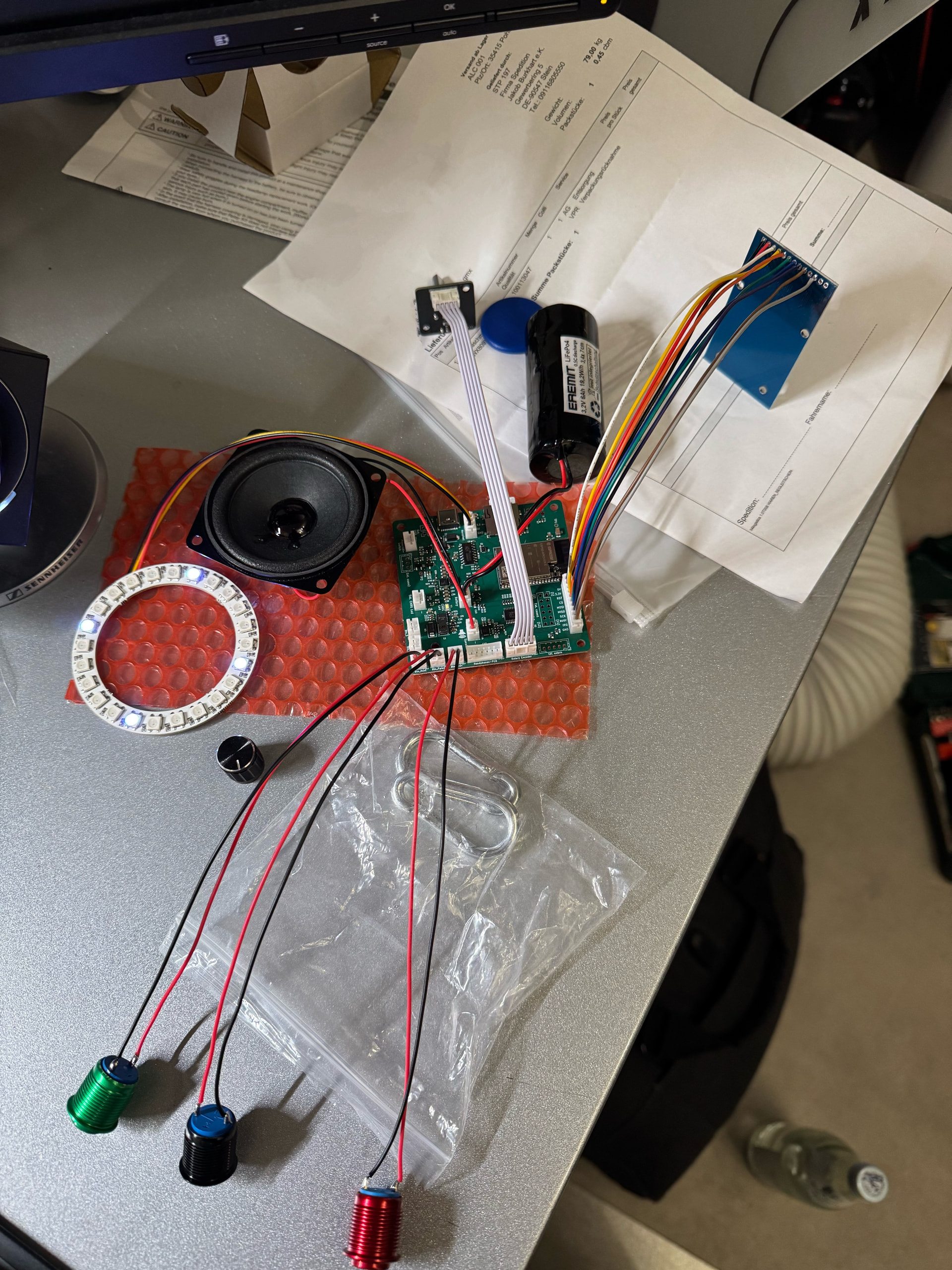 Bei den verwendeten und empfohlenen Tastern geht es ganz schön eng zu (Abstand zum Lautsprecher Einsatz) und den Anschlussleitungen.