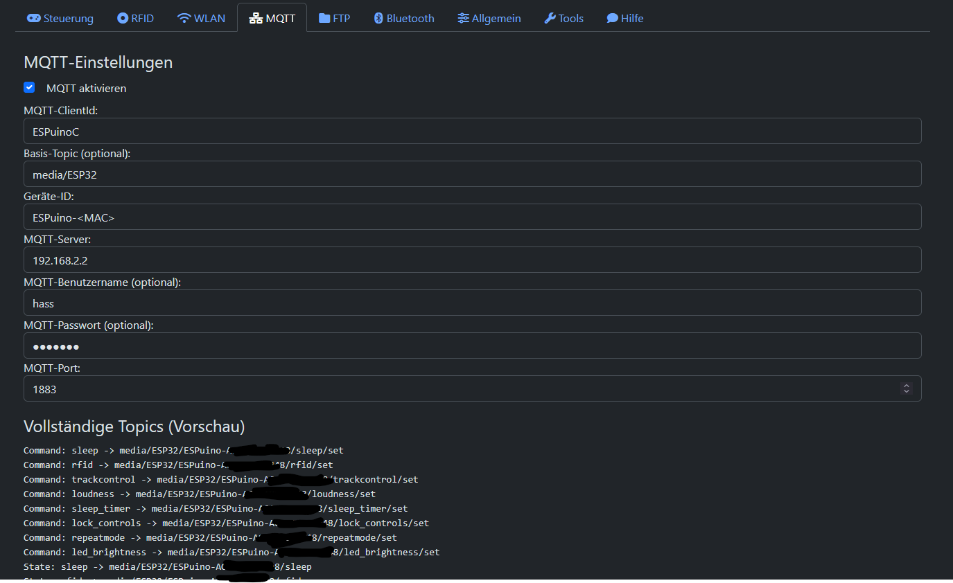 Müssen nicht, aber, würde ich sagen, bei Bedarf können. Ich bin jetzt kein GUI-Experte, aber vielleicht macht es Sinn, sowas wie ESPuino-<MAC-Adresse> als dynamische Basis zu haben und eben alle Topic-Felder dann damit passend mit einer Konkattenierung zu belegen. Oder auch ESPuino-<MAC-Adresse> in einem Feld mit einem Generate-Button und dann werden mit Klick auf den Button alle Topic-Felder gefüllt. Eben mit diesem dynamischen Teil und zusätzlich eben statischer Teil, den man hardcodet in Javascript hat. Gespeichert wird’s auf jeden Fall en bloc (alle Topics zusammen) im NVS.