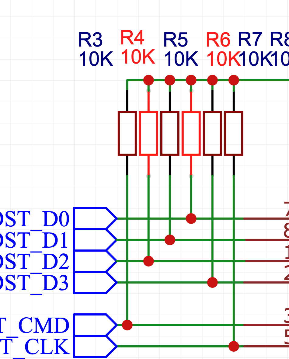I’m using naked sd-card connector, so nothing is pulled by default. I put all pullups to indicate reference schematics, but highlighted resistors will not be placed on the board