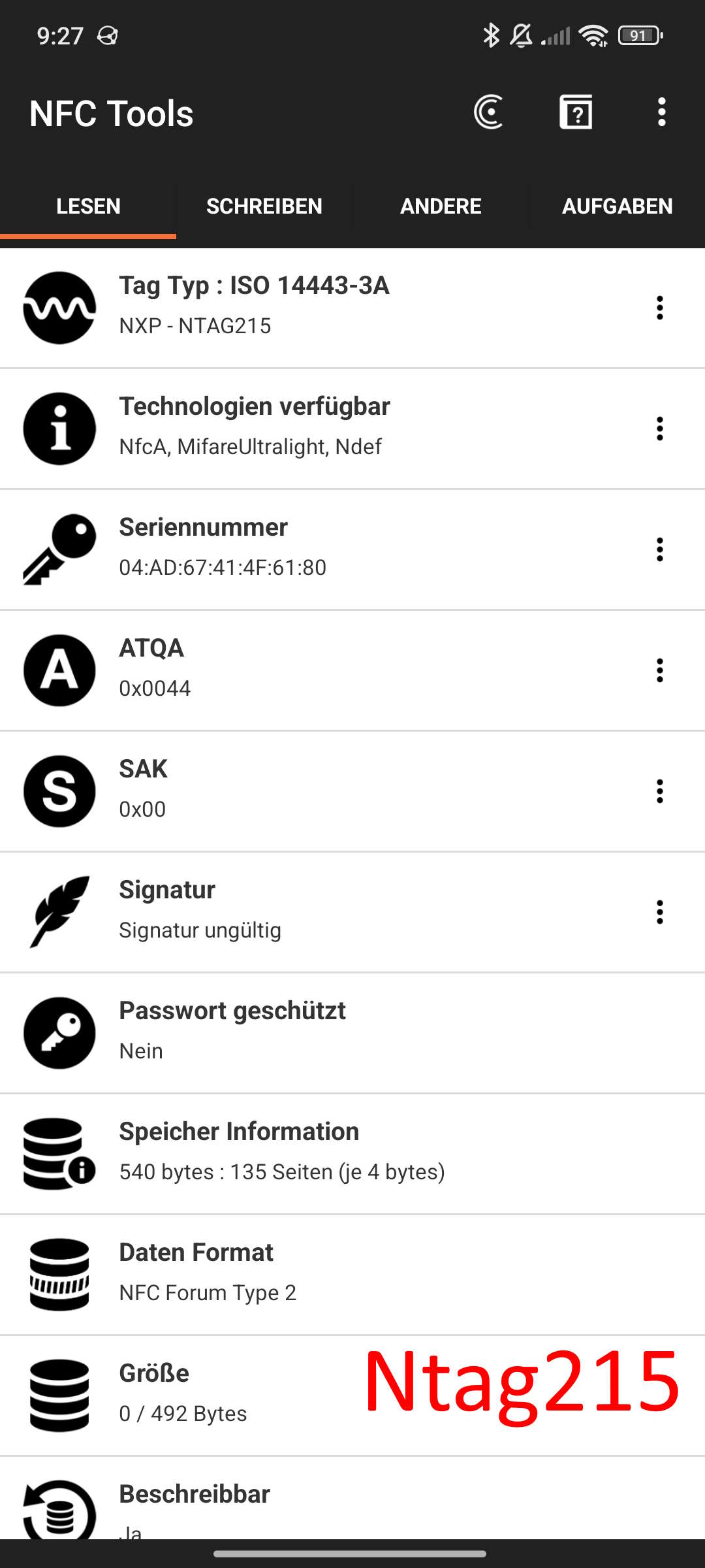 Einzig die NTAG215 funktionieren nicht.