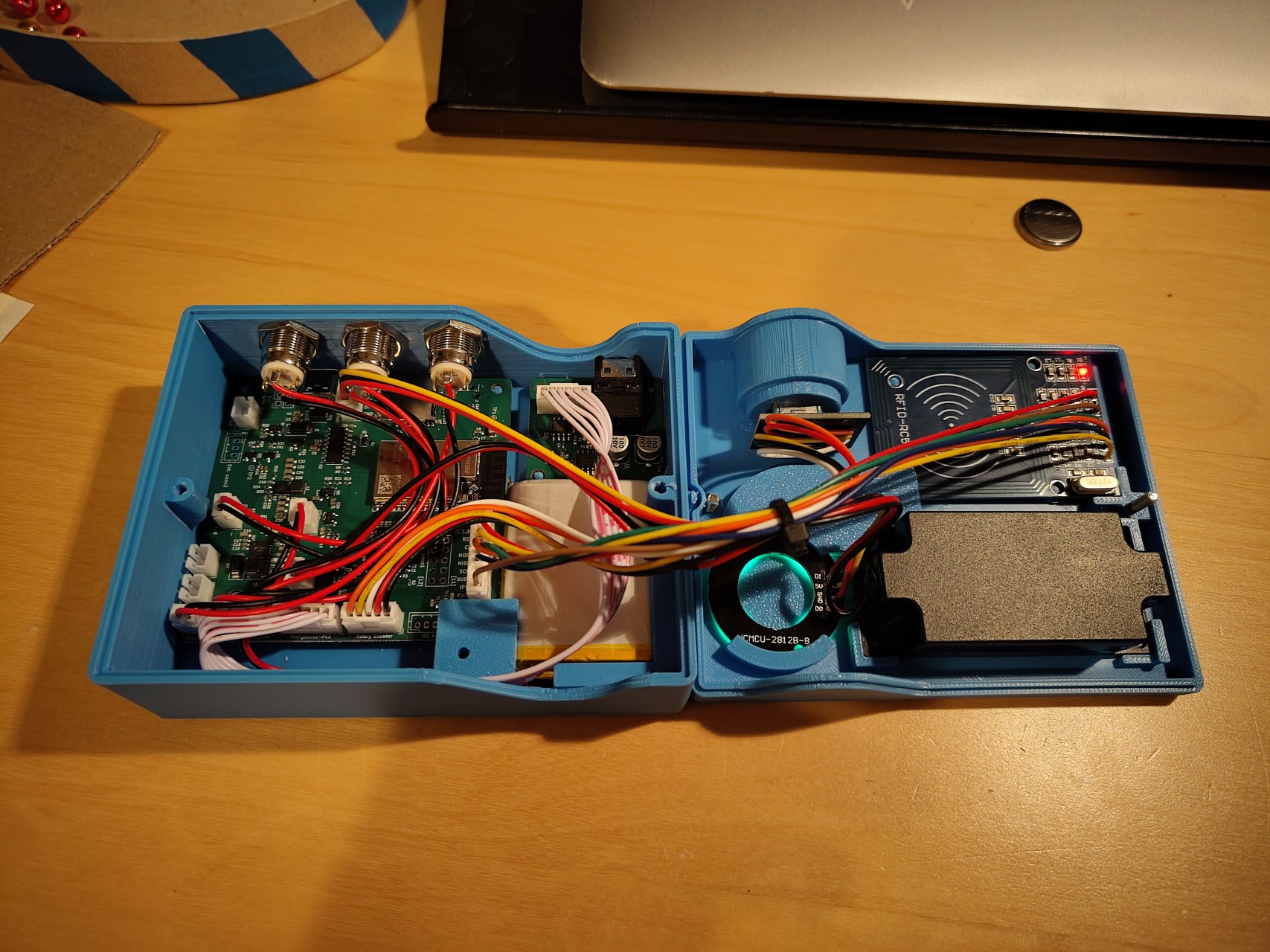 Mein Ziel war ein möglichst kompakter, walkman-inspirierter Spieler. Hauptnutzung wird vermutlich unterwegs sein, weshalb Kopfhörer-Buchse und Bluetooth-Funktion zentral sein sollten. Die Außenmaße sind 11.8 x 9.1 x 4.2 cm.
